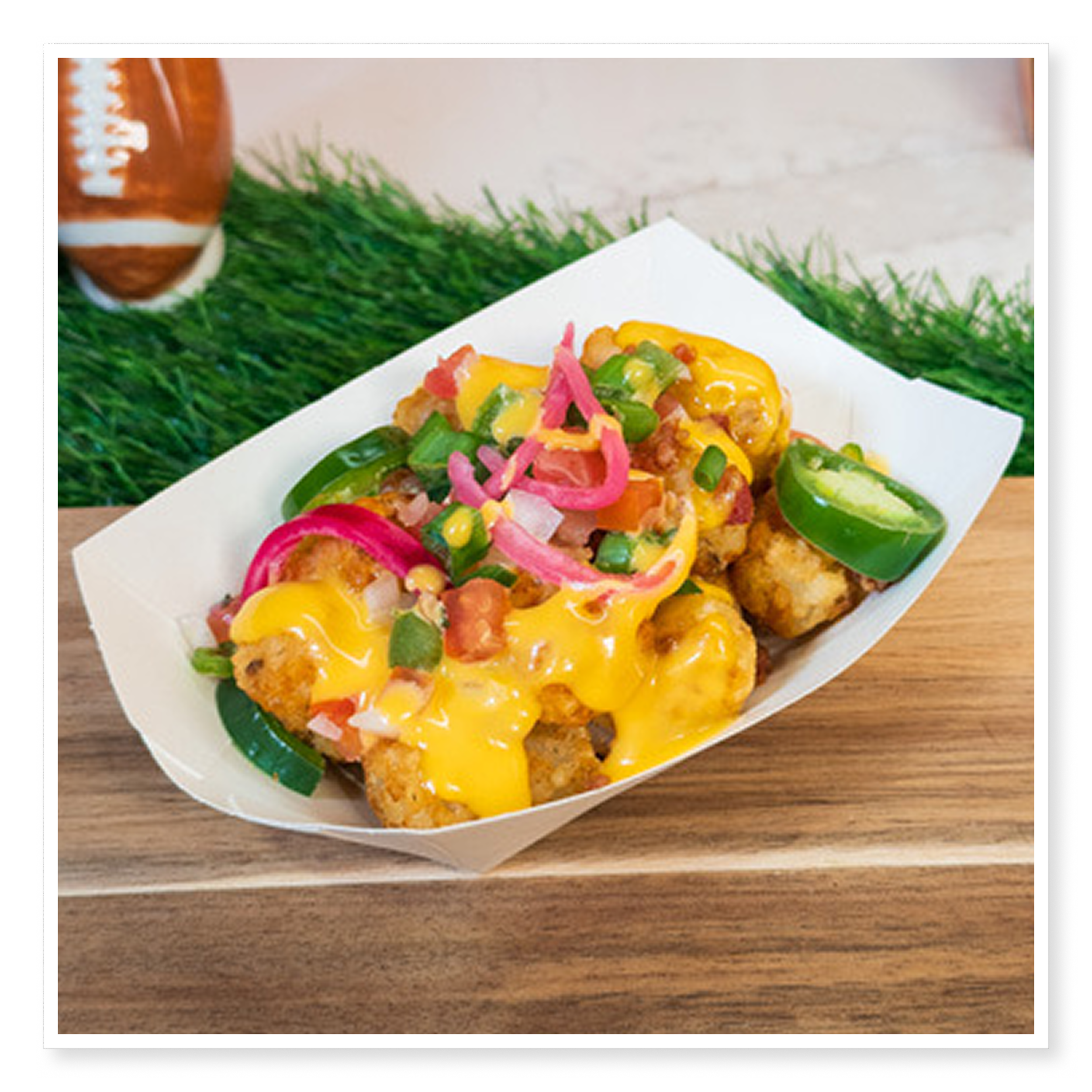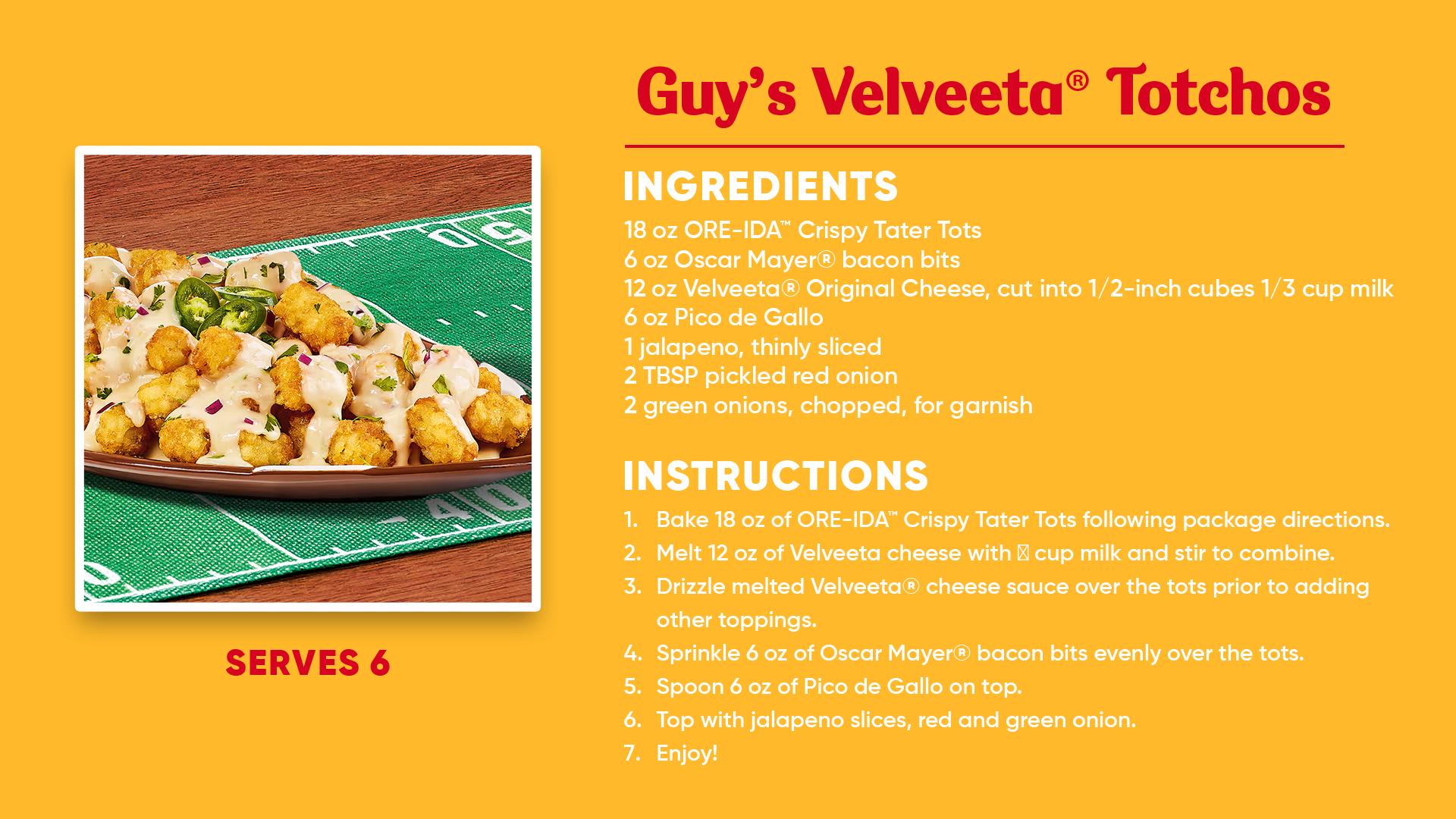 Drizzle melted Velveeta® cheese sauce over the tots prior to adding other toppings.